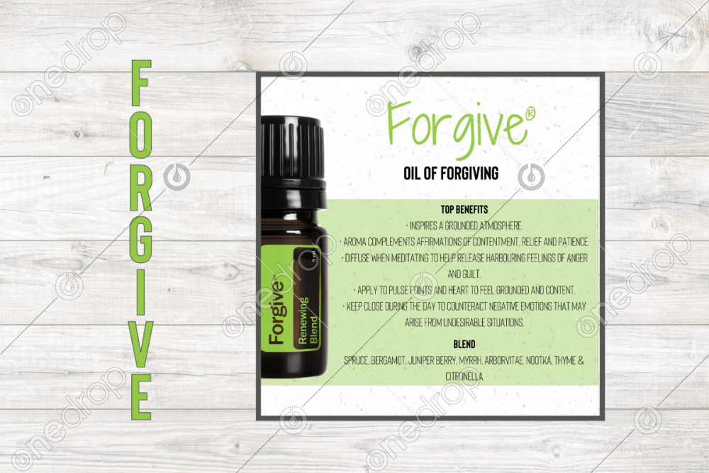 Square infographic with benefits & usage tips of Forgive Essential Oil Blend.