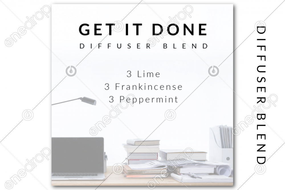 This square graphic features the Get It Done diffuser blend recipe with Lime, Frankincense, and Peppermint with a photo background.