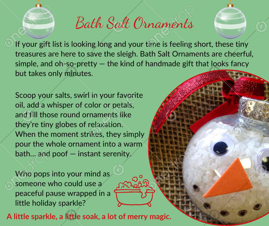Scoop your salts, swirl in your favorite oil, add a whisper of color or petals, and fill those round ornaments like they’re tiny globes of relaxation. When the moment strikes, they simply pour the whole ornament into a warm bath… and poof — instant serenity.