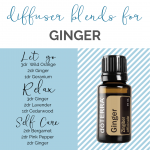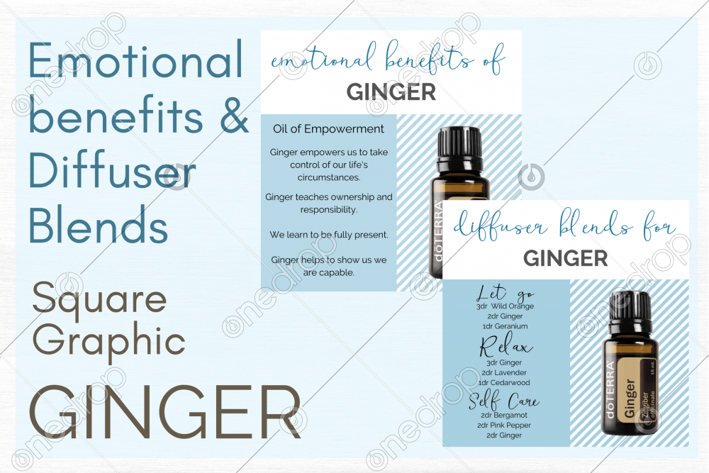 2 square graphics perfect for Facebook and Instagram explaining how Ginger can be used for emotional support and then 3 different diffuser blends using this essential oil.