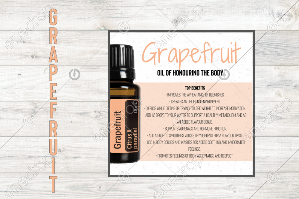 Square infographic with benefits & usage tips of Grapefruit Essential Oil.