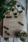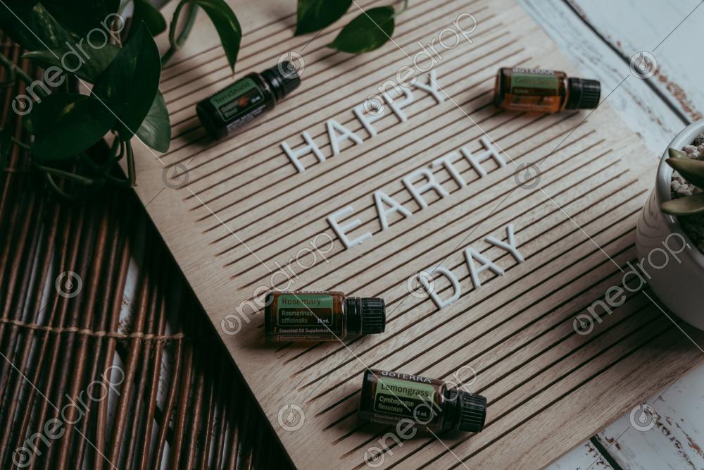 These photos (square and story size) feature letter board with "Happy Earth Day" and 15ml bottles of TerraShield, Celery Seed, Rosemary, and Lemongrass with plants and succulents on ship lap with wood accents