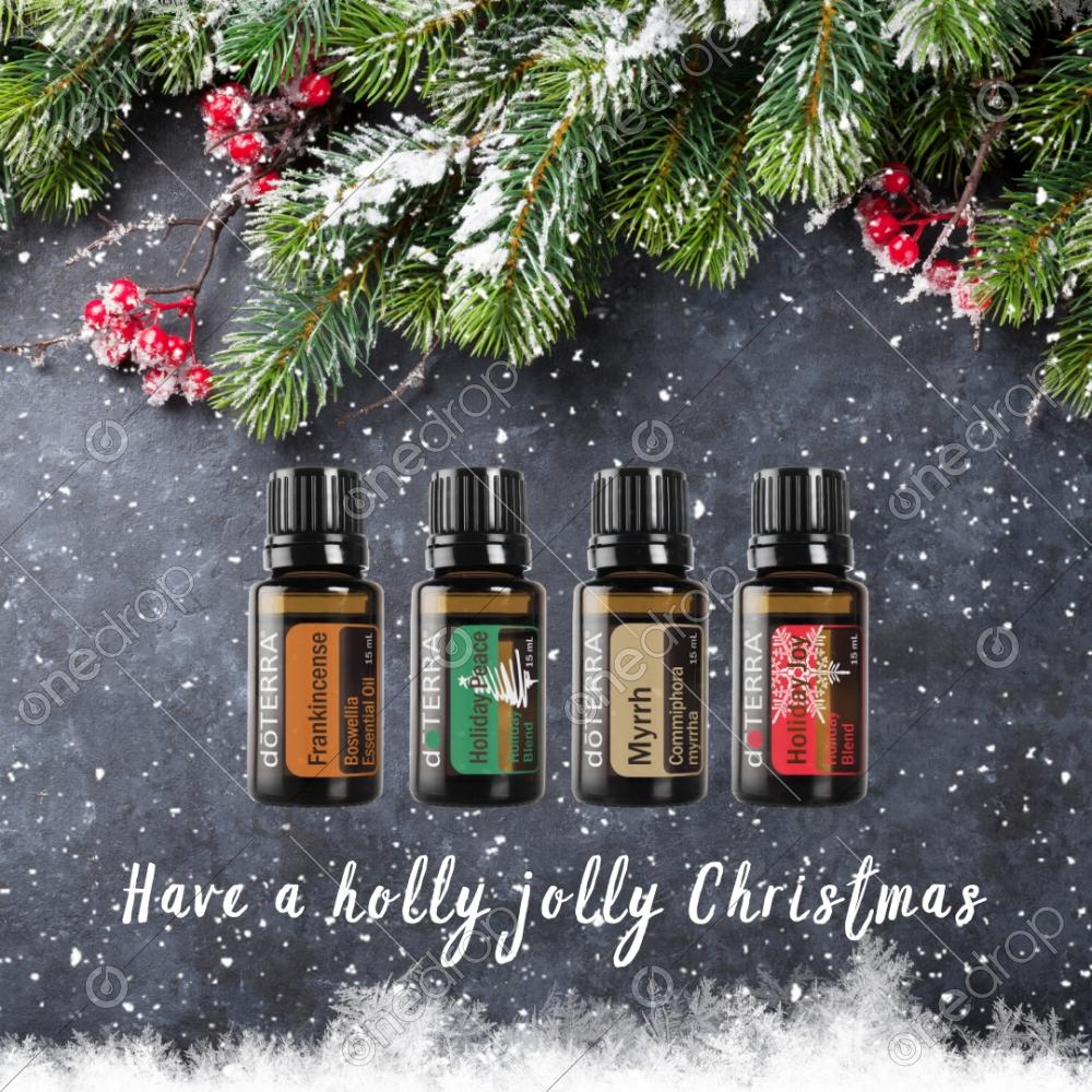 "Have a holly jolly Christmas' social media graphic featuring dōTERRA Frankincense, Myrrh, Holiday Peace and Holiday Joy