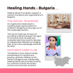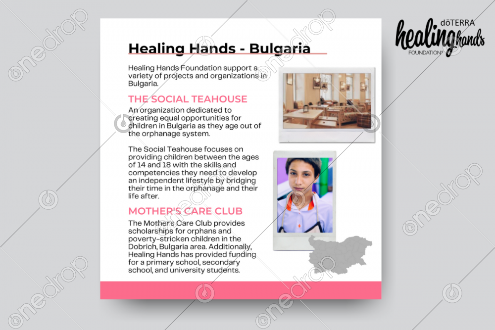 The doTERRA Healing Hands Foundation works with communities all around the world to empower people to make positive sustainable change. In Bulgaria, the projects and organizations include The Social Teahouse and the Mother's Care Club. This graphic showcase both programs.