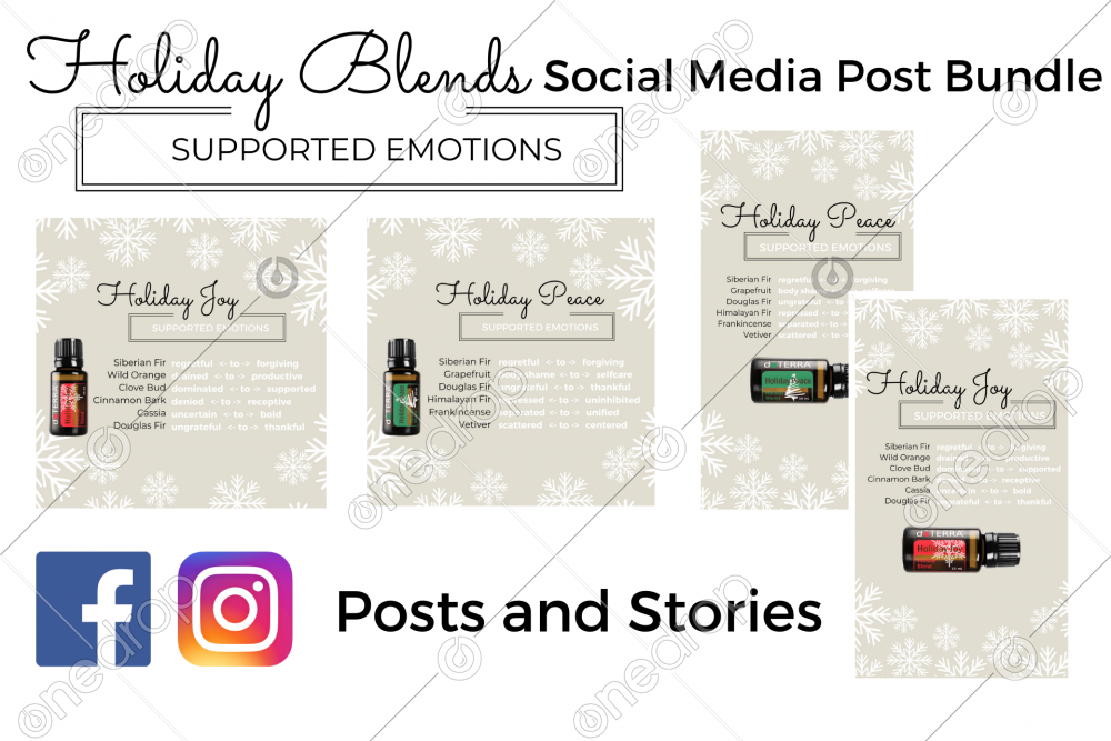 Holiday Joy and Holiday Peace Facebook and Instagram posts and stories with supported emotions listed for each oil in both blends.