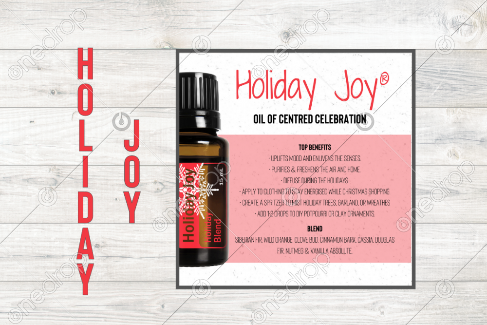 Square infographic with benefits & usage tips of Holiday Joy Essential Oil.