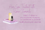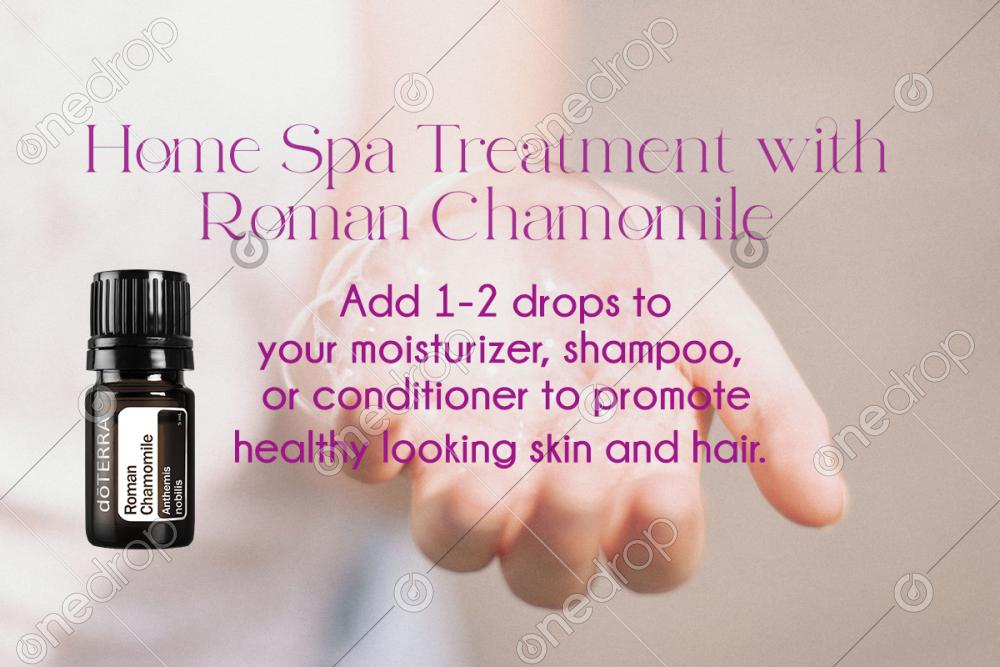 Featuring Roman Chamomile essential oil and its benefits when used topically in moisturizer, shampoo, or conditioner. Two posts with different graphics.