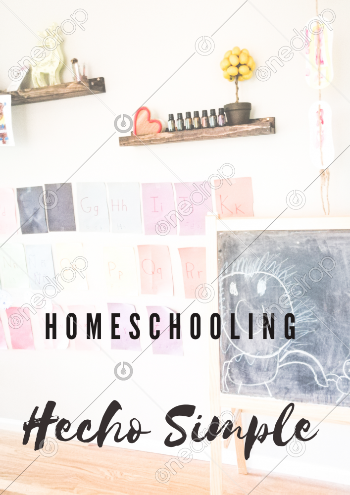 Aprender desde casa, homeschooling, de forma simple y fácil para tus hijos con aceites esenciales. Pared decorada con el alfabeto, estantería con aceites y pizarra.