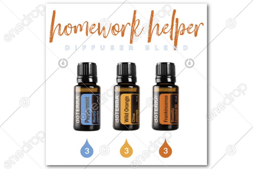 This square graphic features the Homework Helper diffuser blend recipe with Peppermint, Wild Orange, and Frankincense.