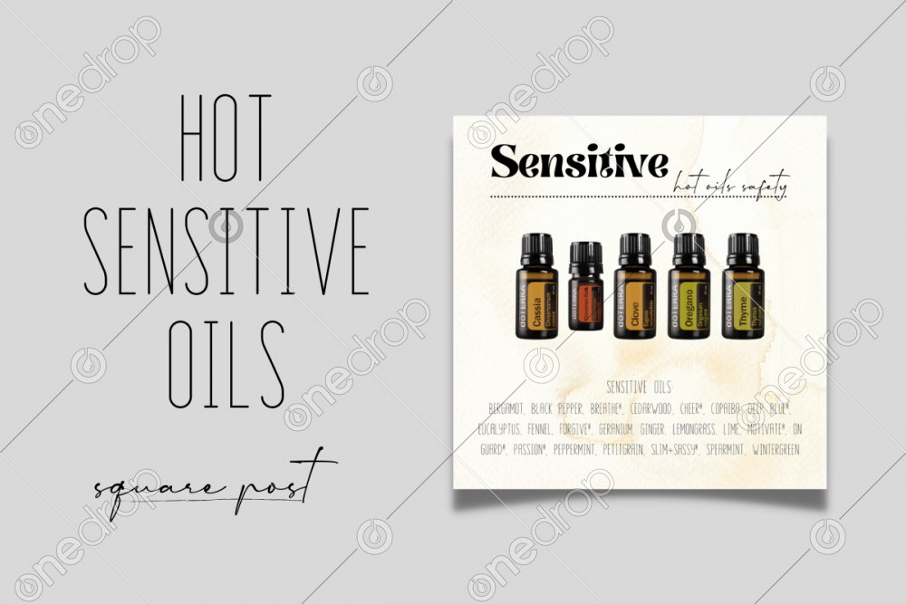 Square post depicting the oils that are described as "hot" and sensitive. It is recommended to dilute with use. Watercolor, boho.