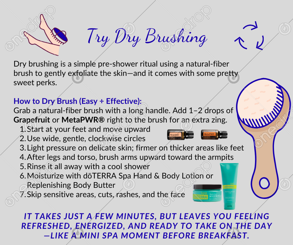 Grab a natural-fiber brush with a long handle. Add 1–2 drops of Grapefruit or MetaPWR® right to the brush for an extra zing.
