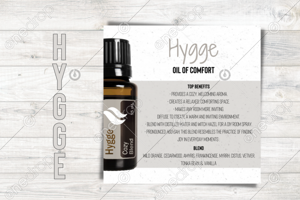 Square infographic with benefits & usage tips of Hygge Essential Oil Blend.