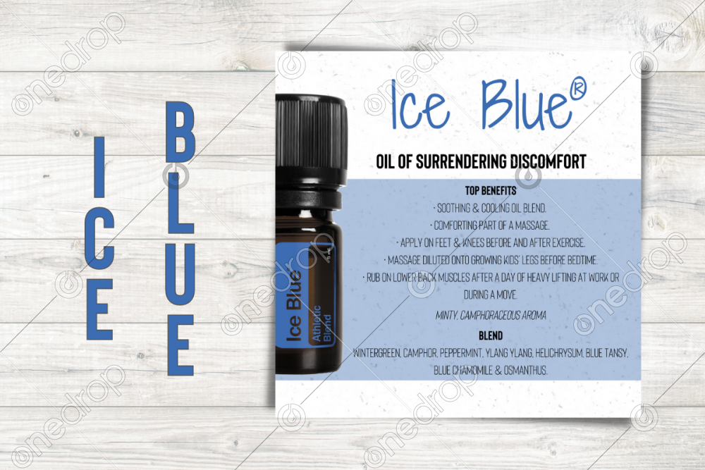 Square infographic with benefits & usage tips of Ice Blue Essential Oil Blend.