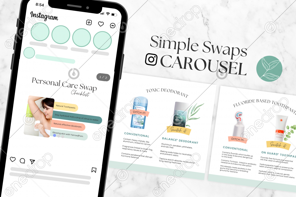 Two ditch and switch options for personal care - Balance deodorant and On Guard toothpaste! Can be used as a Facebook post or Instagram Carousel post (for better reach!).