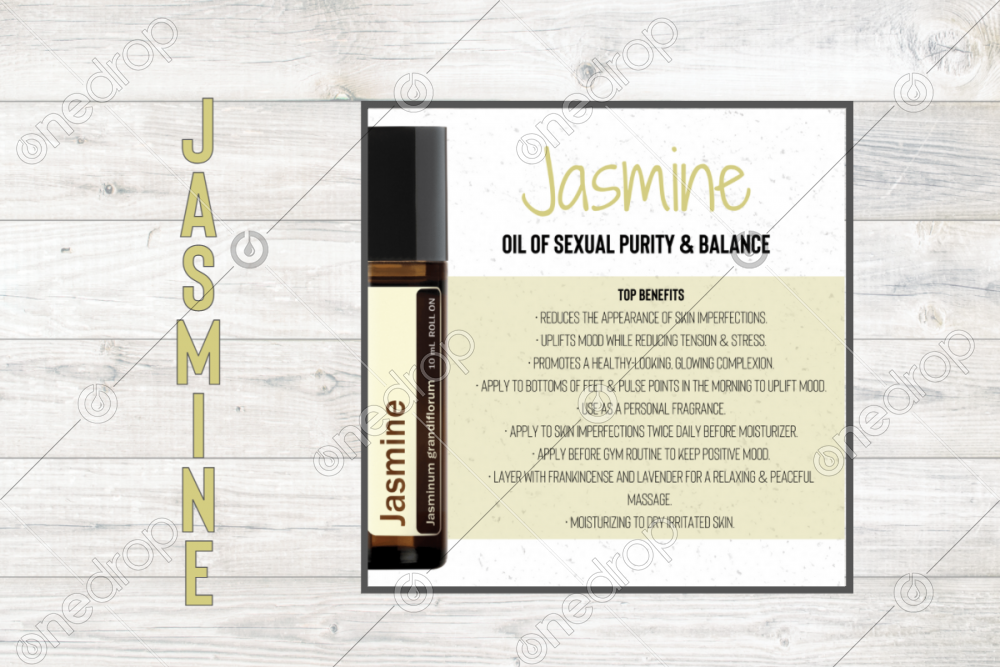 Square infographic with benefits & usage tips of Jasmine Essential Oil.