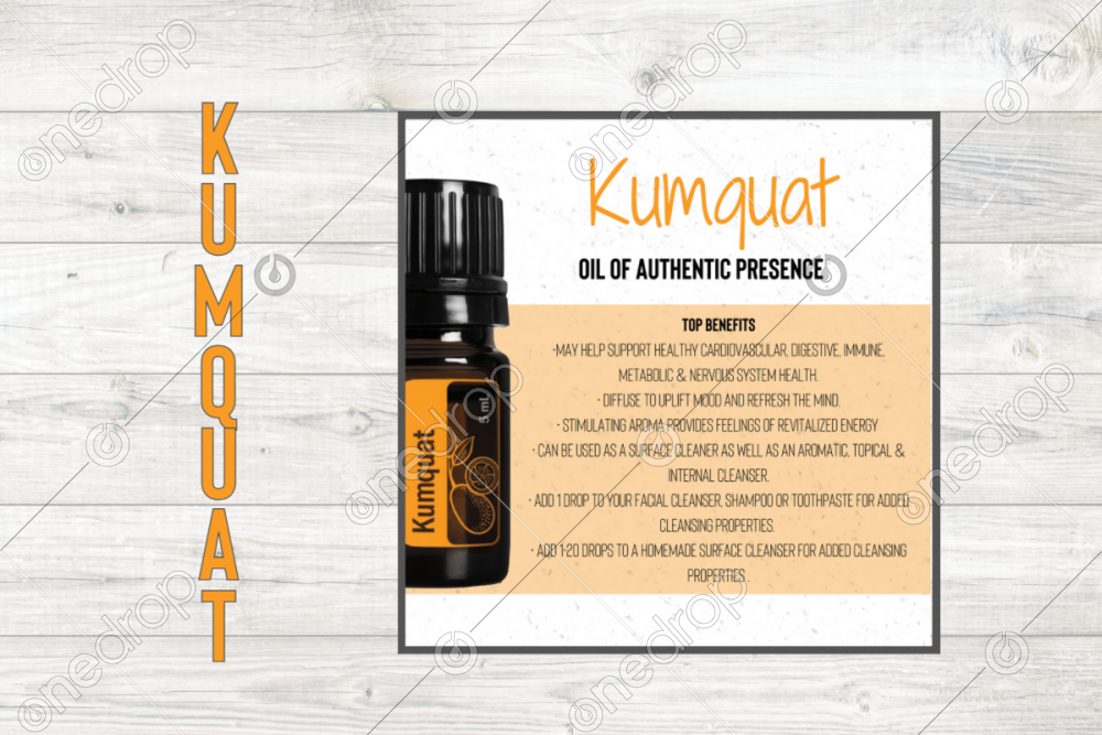 Square infographic with benefits & usage tips of Kumquat Essential Oil.