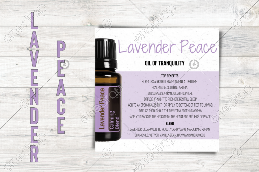 Square infographic with benefits & usage tips of Lavender Peace Essential Oil Blend.
