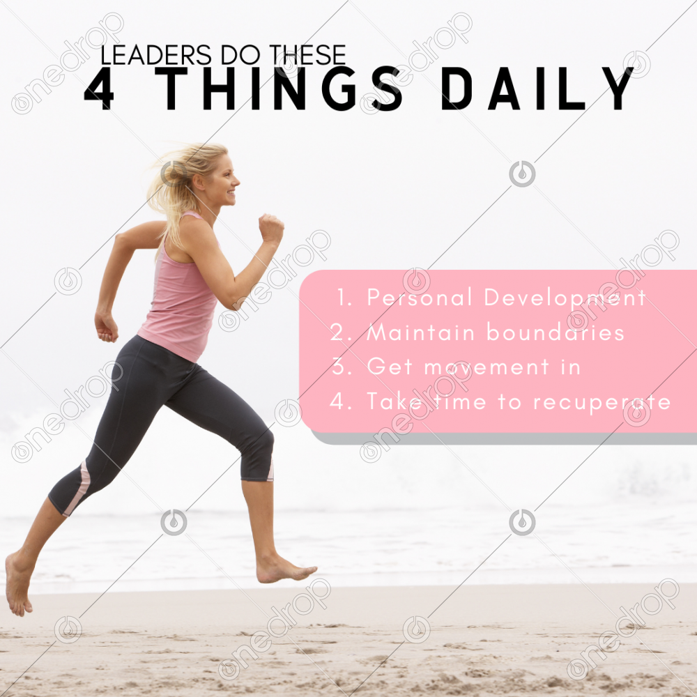Leaders want to keep the needle moving forward. Here are the 4 things they do daily: Personal Development Maintain boundaries Get movement in Take time to recuperate Do you struggle with any of these? How do you fit these into your day? Suggested photo uses: