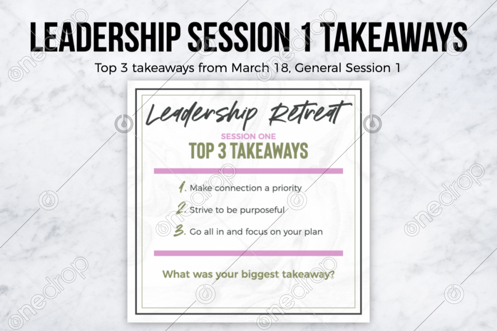 One square graphic listing out top 3 takeaways from Leadership Retreat General Session 1 on March 18, with engagement question for your leaders to share their top takeaway from the first session.