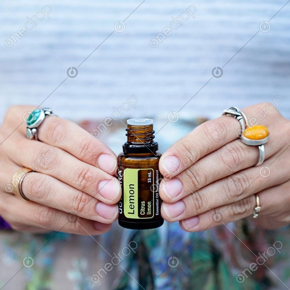 Close up shot of Lemon 15 mL bottle in hands.