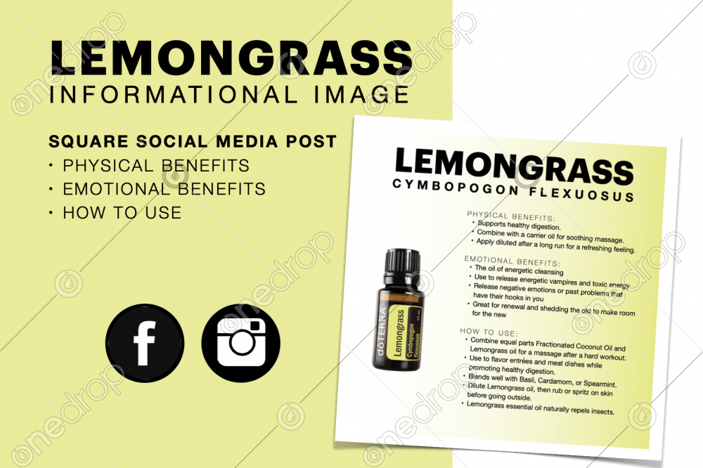 Square Social Media Image with Physical Benefits, Emotional Benefits + How to Use for Lemongrass Essential Oil