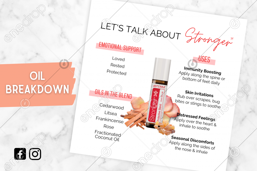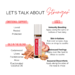 An oil breakdown for Stronger. Includes oil uses, emotional benefits as well as what is inside.