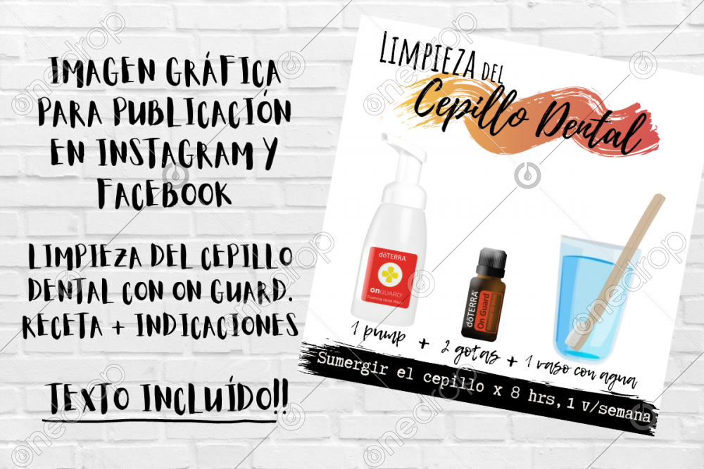 Esta imagen gráfica en formato cuadrado para publicación de Instagram y/o Facebook, contiene la receta para preparar un poderoso limpiador y desinfectante del Cepillo Dental a base de productos de la línea On Guard, de forma fácil y sencilla. Una práctica rutinaria necesaria para asegurar una buena Salud Bucal!