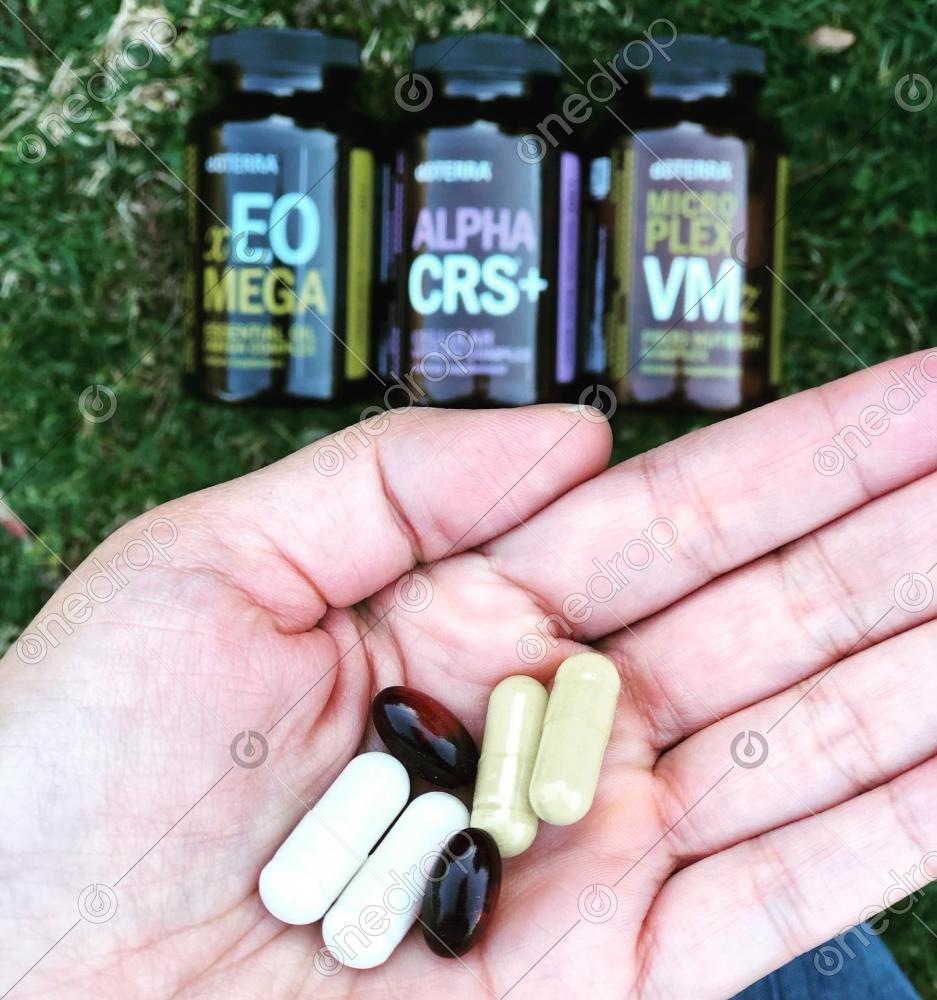 Photograph holding LLV vitamins with vitamin bottles in background.
