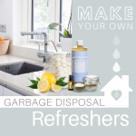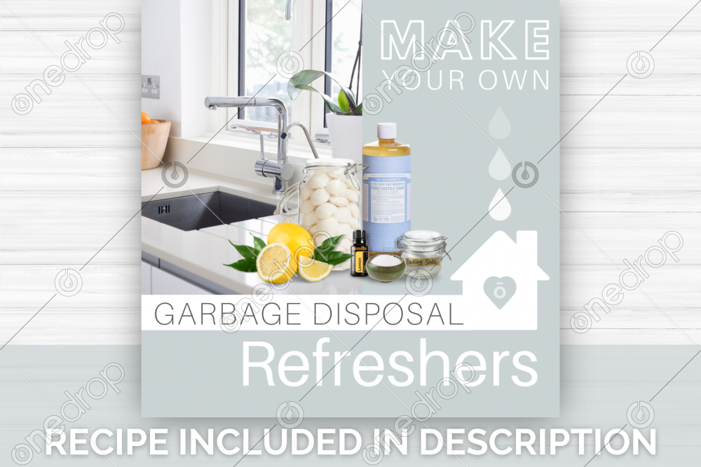 - Features a background image of a kitchen sink + the following ingredients to make your own Garbage Disposal Refreshers; Baking soda, Castile Soap, Salt, Lemon essential oil, and a jar filled with the finished product.