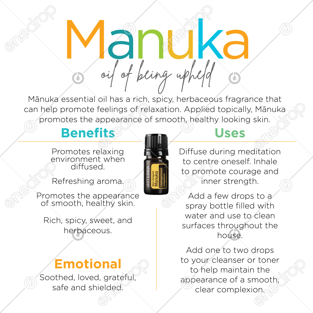 Revered by the Maori people for its many invigorating properties, Mānuka has been used for centuries in New Zealand. doTERRA’s New Zealand Manuka Essential Oil is a pure steam distillation of the potent aromatic compounds found in the flowers, leaves and stems of the Mānuka tree. Mānuka essential oil has a rich, spicy, herbaceous fragrance that can help promote feelings of relaxation. Use Mānuka essential oil to help ground and centre energies in preparation for deep meditation. Mānuka essential oil can also be diffused for a refreshing aroma. Applied topically, Mānuka promotes the appearance of smooth, healthy looking skin.
