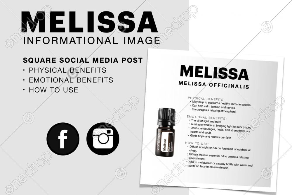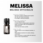 Square Social Media Image with Physical Benefits, Emotional Benefits + How to Use for Melissa Essential Oil