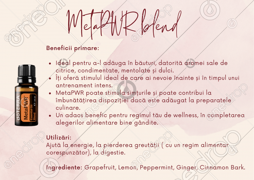 Amestecul de uleiuri esențiale MetaPWRTM este conceput pentru a susține un stil de viață axat pe creșterea vitalității, îmbunătățirea alegerilor alimentare și menținerea stării de bine.