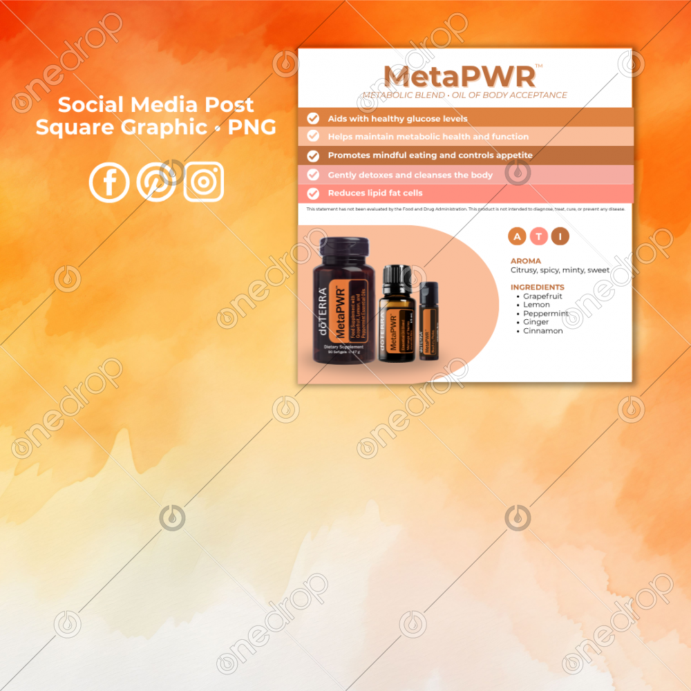 At-a-glance square graphic with an overview of MetaPWR™ Metabolic Blend Square graphic 1080x1080 with MetaPWR™ 15mL essential oil, softgels and beadlets Orange/peach colors Perfect to share with customers or post for a quick overview Social media posts Blog post images eBooks Pintrest pins Instagram Stories Facebook Stories Texting WhatsApp