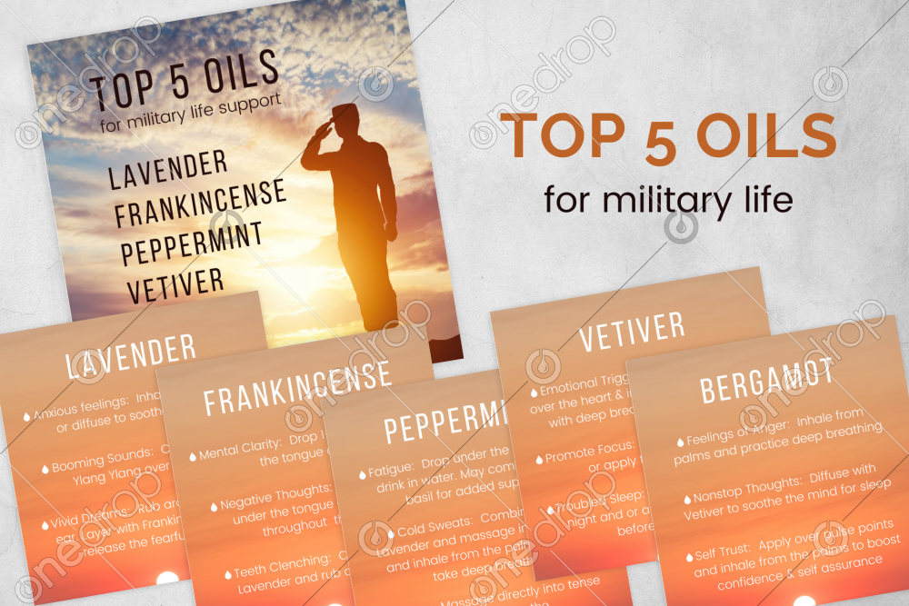 Share your gratitude for our military men and women by sharing the top 5 essential oils to support them through many of the hard situations that come from their service.