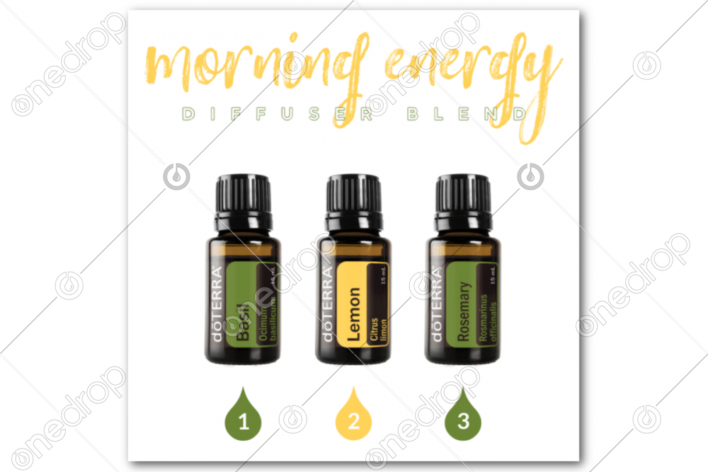 This square graphic features the Morning Energy diffuser blend recipe with Basil, Lemon, and Rosemary.