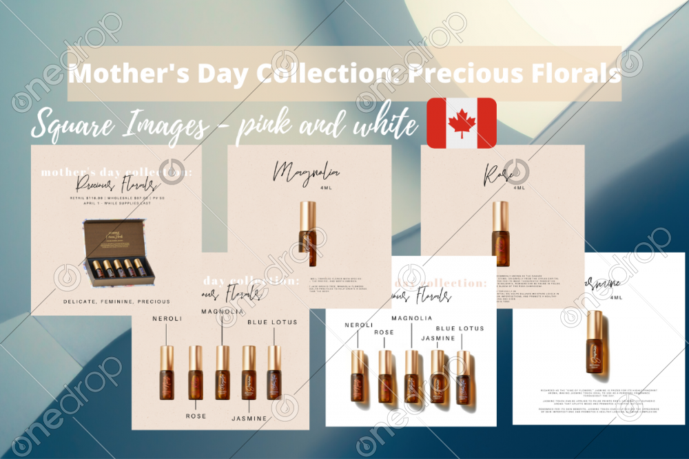 Square social media graphic Series on the Precious Petal Mother's Day Collection with pricing for the Canadian market. Bonus White bundle. Each bundle contains an individual spotlight on each oil.