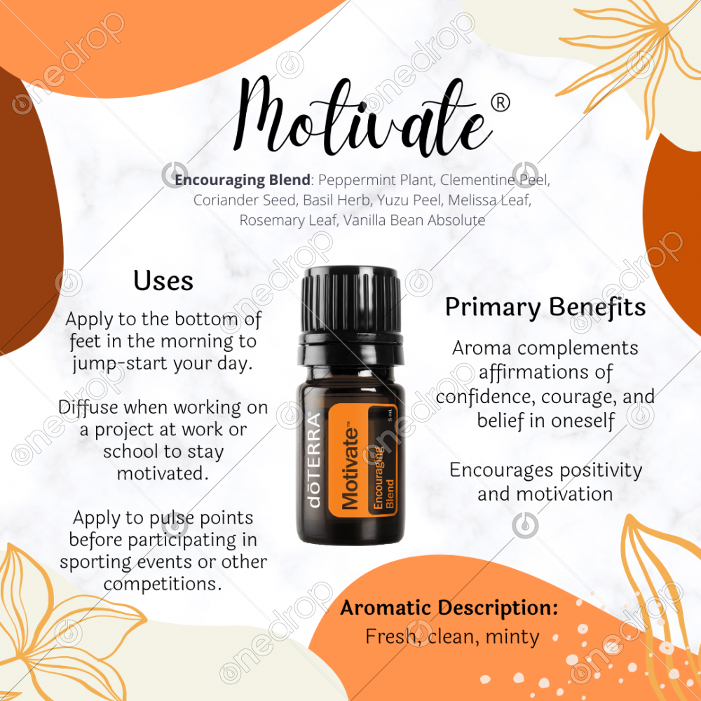 One image with description of Motivate oil including primary benefits and uses.