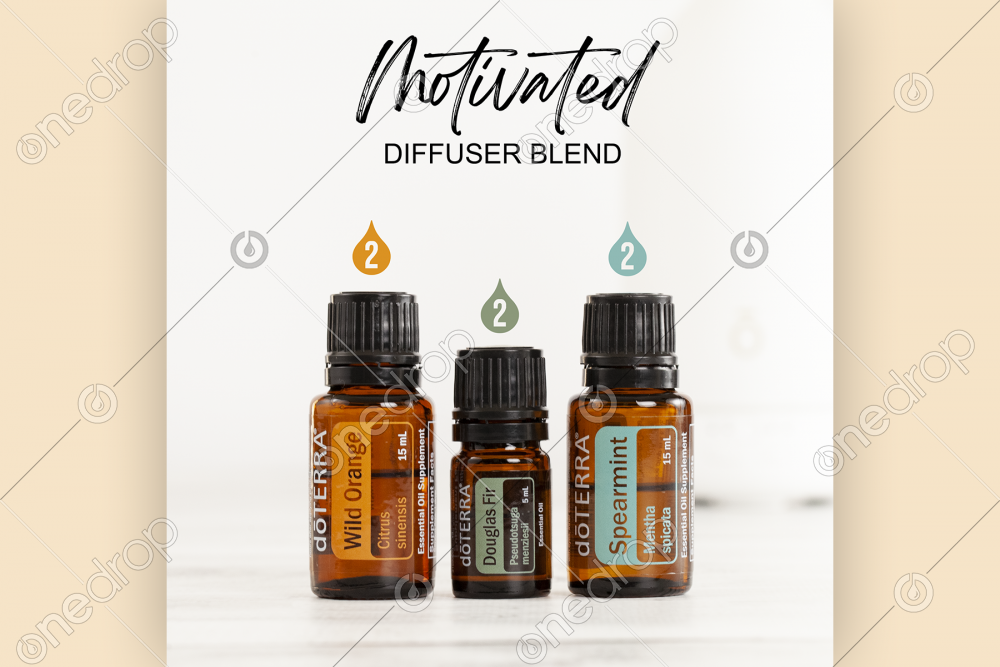High resolution square picture of the Motivated diffuser blend featuring Douglas Fir + Wild Orange + Spearmint.