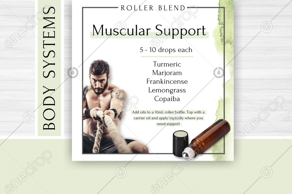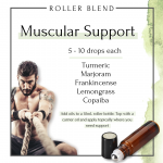 - Features a Muscular Support Roller Blend; 5-10 drops each of Turmeric, Marjoram, Frankincense, Lemongrass, and Copaiba.