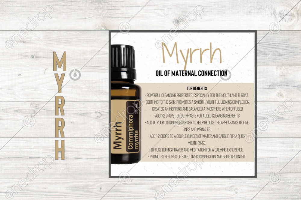 Square infographic with benefits & usage tips of Myrrh Essential Oil.