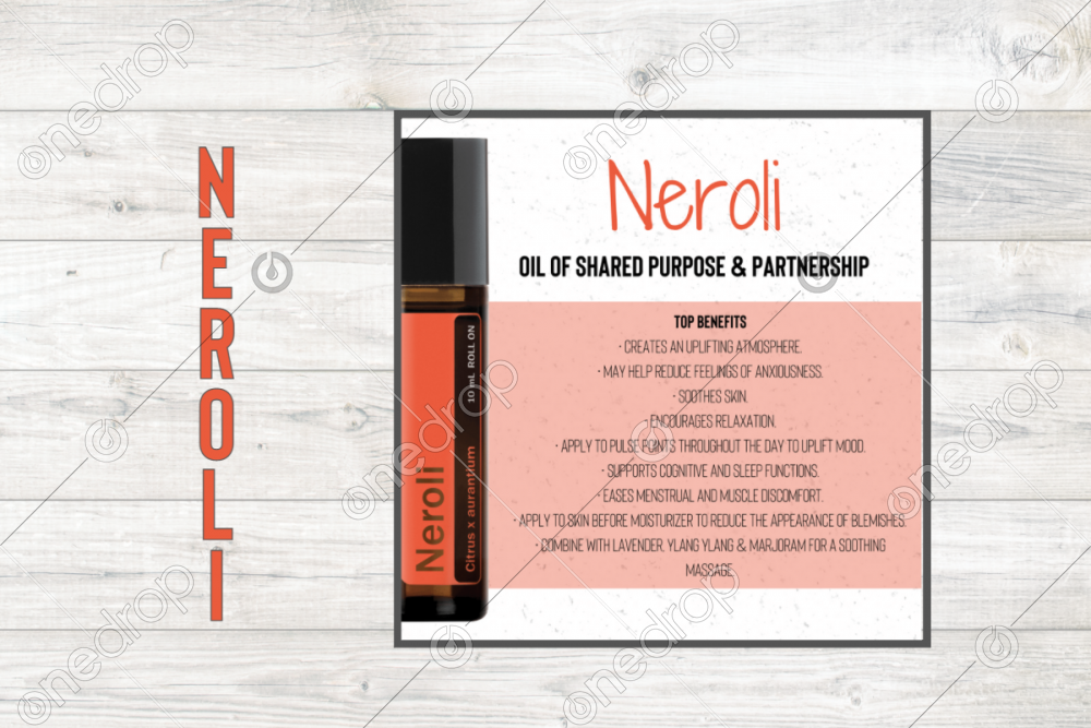 Square infographic with benefits & usage tips of Neroli Essential Oil.