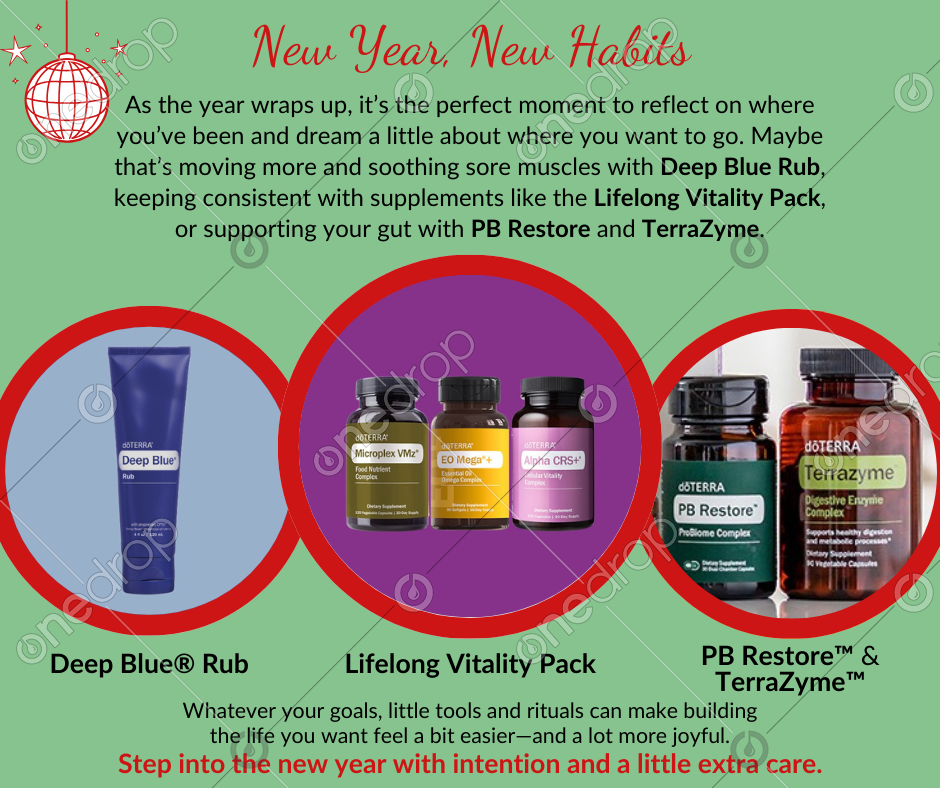 As the year wraps up, it’s the perfect moment to reflect on where you’ve been and dream a little about where you want to go. Maybe that’s moving more and soothing sore muscles with Deep Blue Rub, keeping consistent with supplements like the Lifelong Vitality Pack, or supporting your gut with PB Restore and TerraZyme.