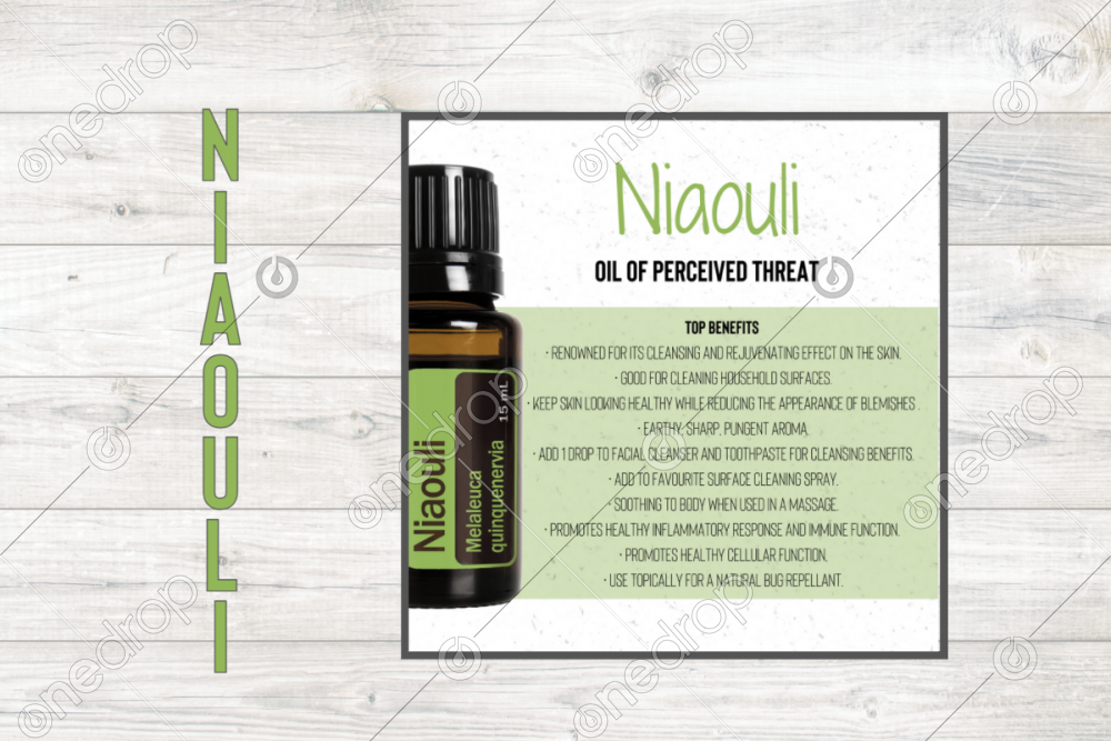 Square infographic with benefits & usage tips of Niaouli Essential Oil.