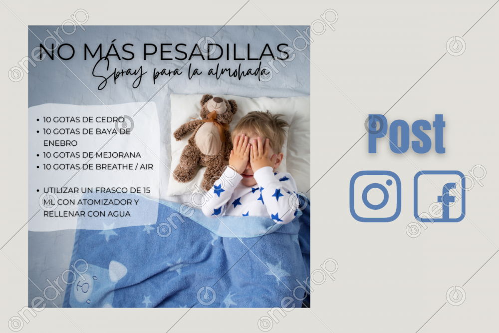 Imagen en formato cuadrado para Post de Instagram / Facebook con la receta para preparar la mezcla de spray para la almohada: No más Pesadillas.