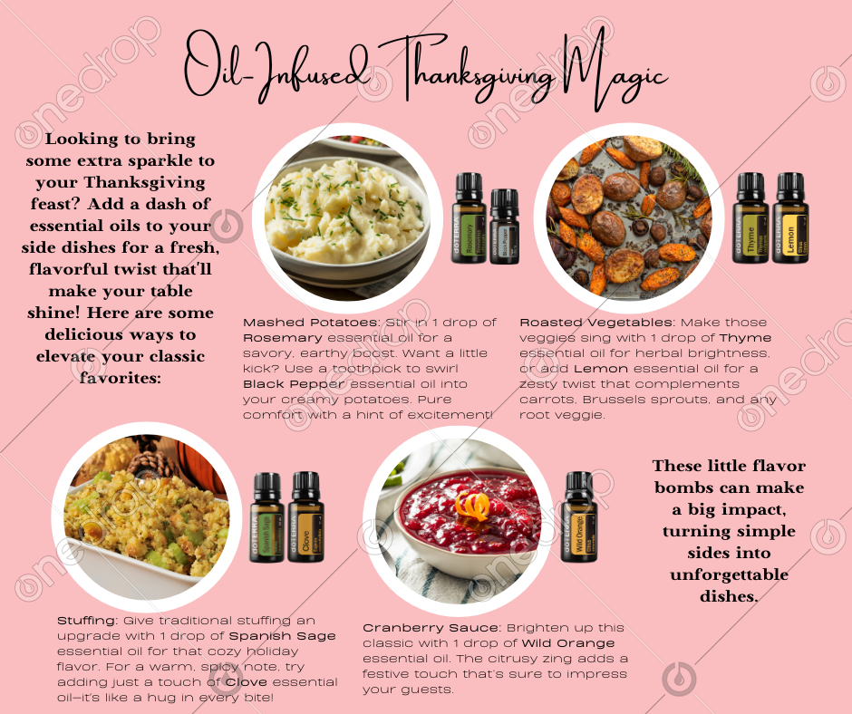 Looking to bring some extra sparkle to your Thanksgiving feast? âš Add a dash of essential oils to your side dishes for a fresh, flavorful twist that'll make your table shine! ð±ð§âð³ Here are some delicious ways to elevate your classic favorites: