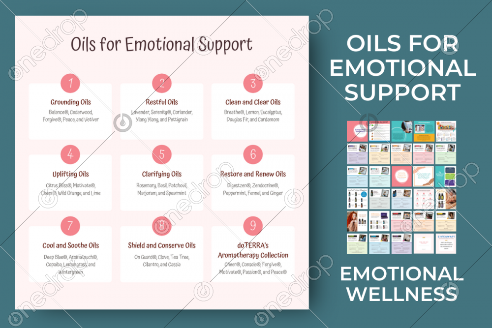 This graphic is part of the Emotional Wellness Collection with the Done-For-You-Copy. The topics include mood & oils, AromaTouch® Technique, and highlights of the Kid’s Collection and Emotional Aromatherapy® Kit essential oils. (The Done-For-You-Copy is downloaded separately). All the graphics for the collection are below!