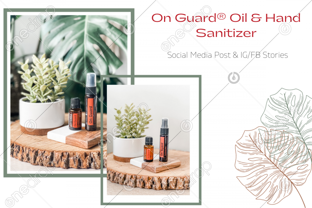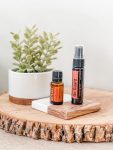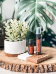 dōTERRA On Guard® 15ml Oil Bottle & On Guard Hand Sanitizing Mist - on rustic wood display with plant