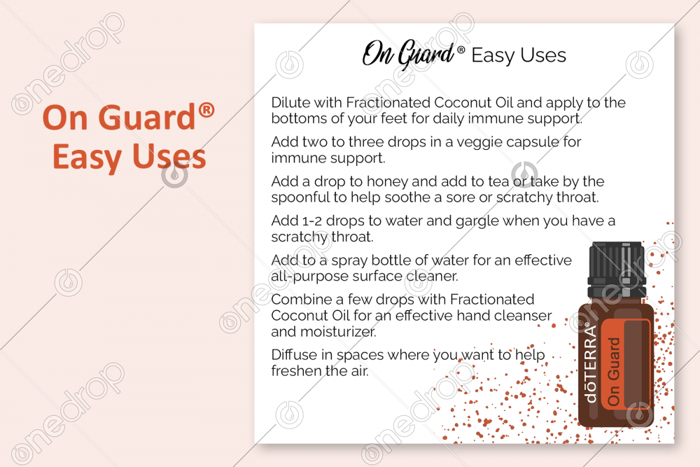 This image shares 5 easy uses for On Guard® with illustrated bottle. 📌Please make sure to watermark images with your name/logo to protect your investment and make sure One Drop contributors are fairly compensated for their work and direct your sharers back to One Drop to download their own 😀