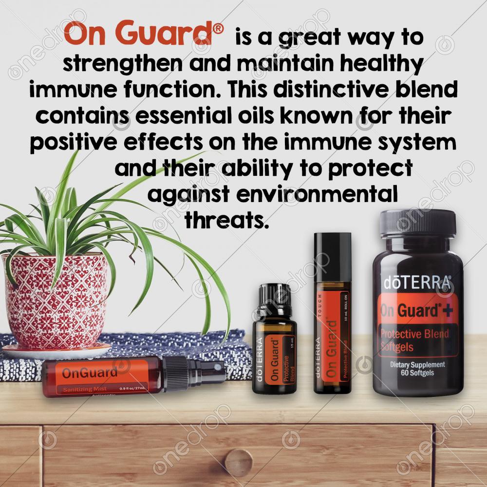 This general infographic about On Guard includes the oil, roller, mist, and softgels.
