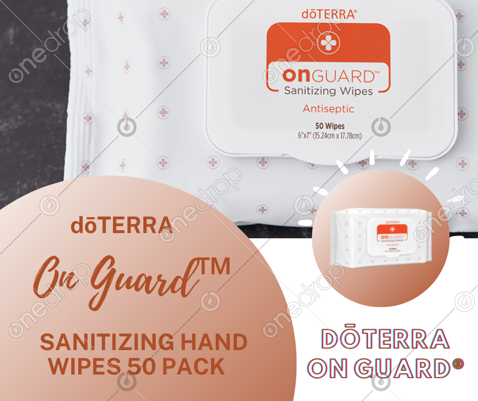 doTERRA On Guard® Sanitizing Wipes are biodegradable and are available in a pack of 50 with a flip top that closes securely to keep wipes moist.Fonts: